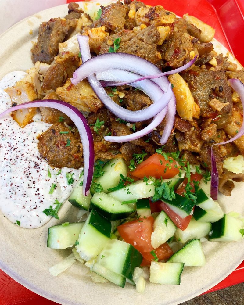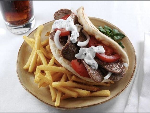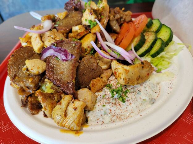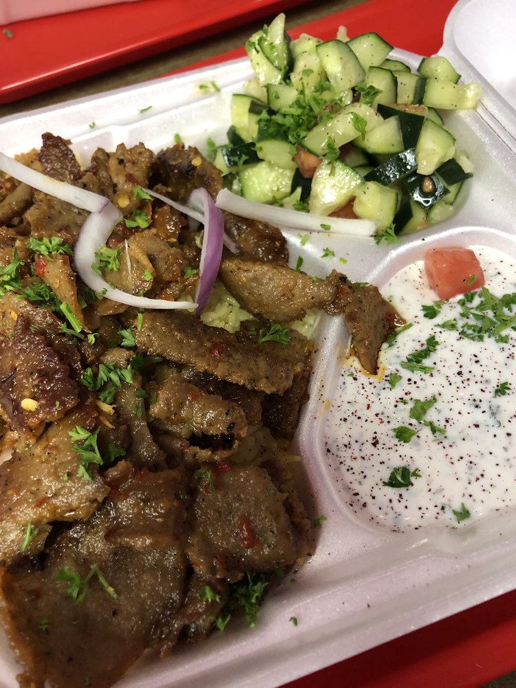 Gyro Plate - Grilled Beef served with rice, salad, Cucumber sauce, hot sauce (optional) & Warm pita bread.